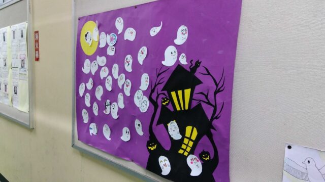 ハロウィンの掲示物にいろいろな表情のおばけを楽しそうに貼ってくれました。1年生の集まりが早く、13時03分くらいに...
