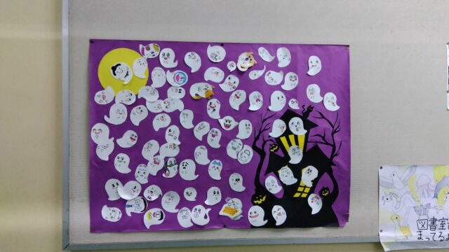 図書チームで作成したポスターに個性溢れる可愛いおばけちゃんたちを子どもたち貼ってもらいました。